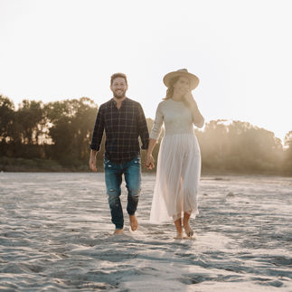 Coppia al tramonto in spiaggia, si guarda con amore in attesa della nascita del proprio figlio